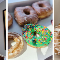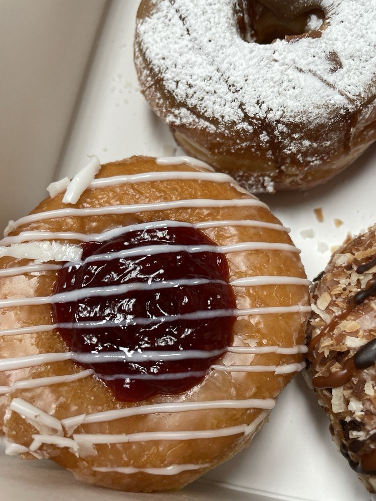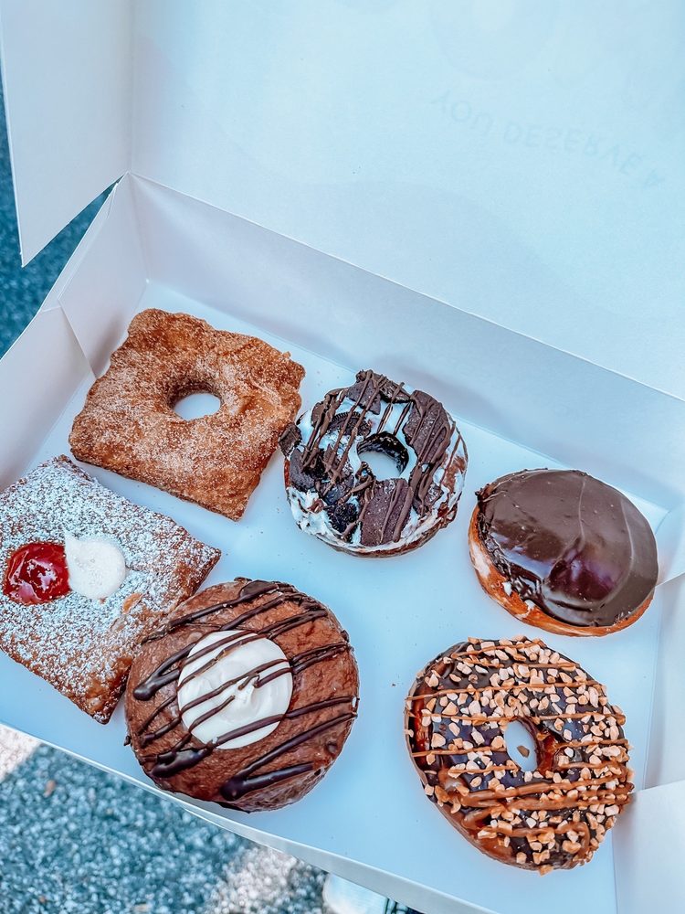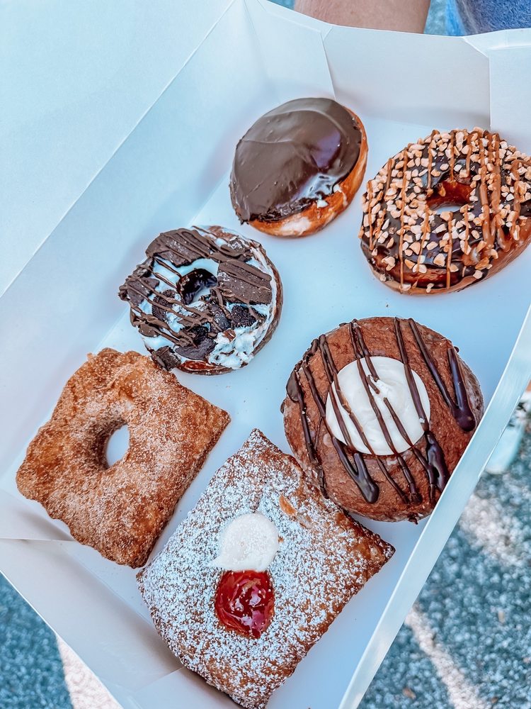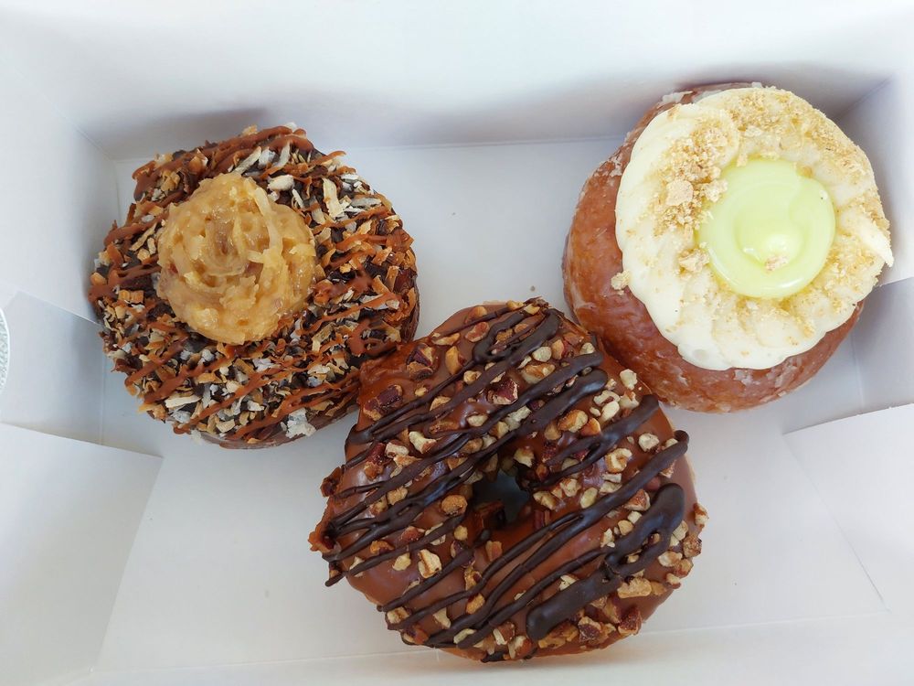 Variety of donuts including glazed, chocolate, nut, fruit, cream-filled options, and unique flavors like key lime and snickers. Choose from squares, cronuts, and traditional shapes.