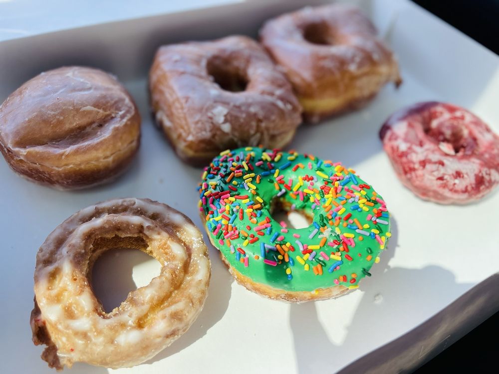 Half dozen fancy donuts with choices including almond joy, various fruit flavors, creams, chocolates, bacon, pretzel, and dessert inspired like snickers, smores. Pick any six.